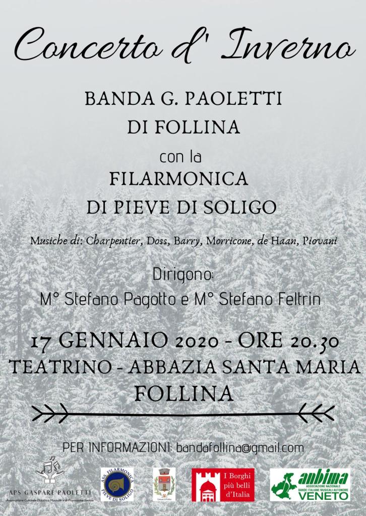 Non mancate al CONCERTO D’INVERNO con la Banda di Follina e la Filarmonica di Pieve di Soligo, venerdì 17 gennaio 2020 alle ore 20.30 presso il Teatrino dell’Abbazia Santa Maria di Follina … con sorpresa finale e brindisi per il nostro amato pubblico .