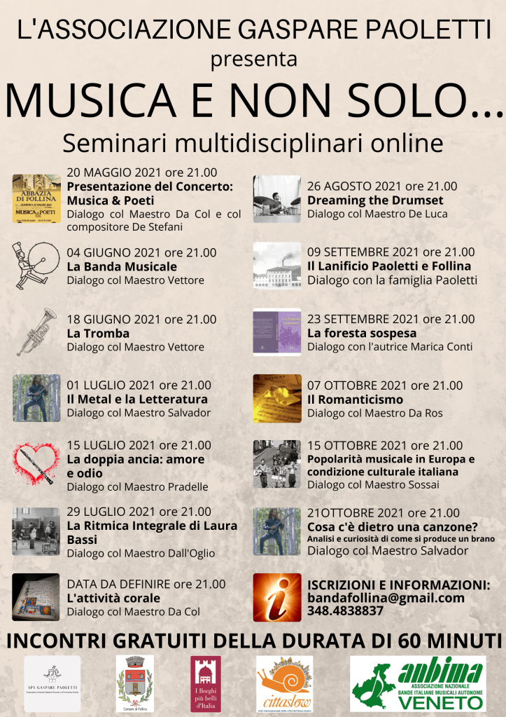 Gli incontri saranno online, saranno gratuiti e aperti a tutti gli interessati che avranno prenotato il proprio accesso inviando una mail alla segreteria dell’APS Gaspare Paoletti all’indirizzo bandafollina@gmail.com.