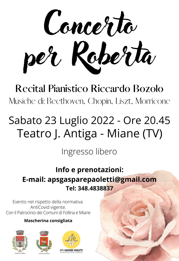 Si svolgerà sabato 23 luglio 2022 alle ore 20.45 presso il Teatro J. Antiga di Miane il “Concerto per Roberta” Recital Pianistico con il Maestro Riccardo Bozolo che eseguirà brani di L. van Beethoven, F. Chopin, F. Liszt e Morricone.