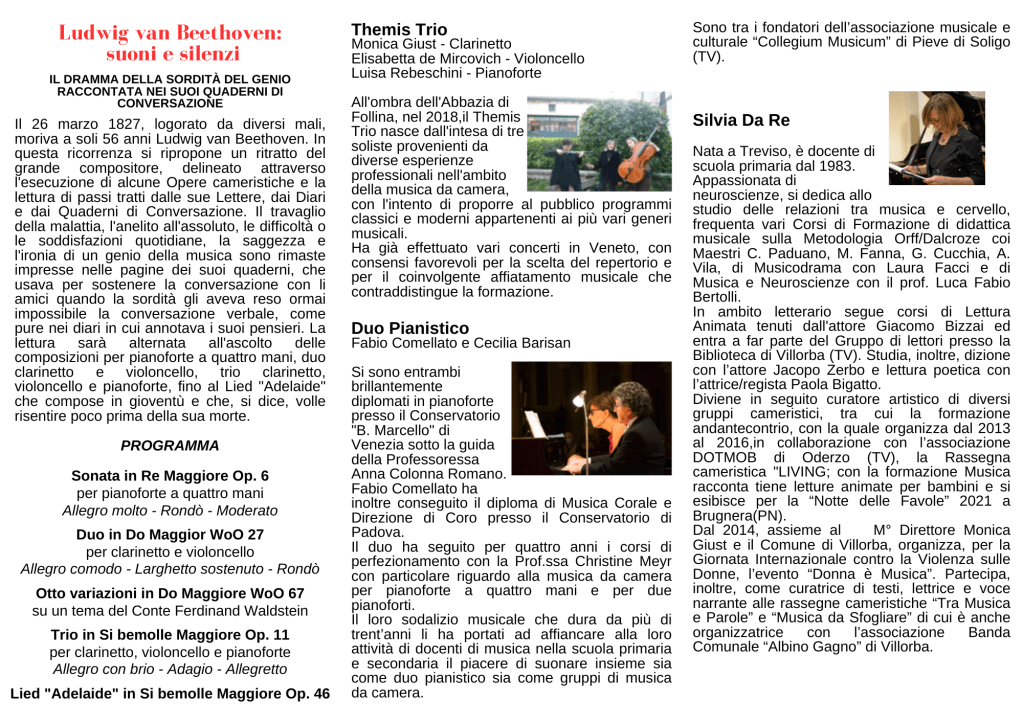 La lettura sarà alternata all’ascolto delle composizioni per pianoforte a quattro mani, duo clarinetto e violoncello, trio clarinetto, violoncello e pianoforte, fino al Lied “Adelaide” che compose in gioventù e che, si dice, volle risentire poco prima della sua morte.