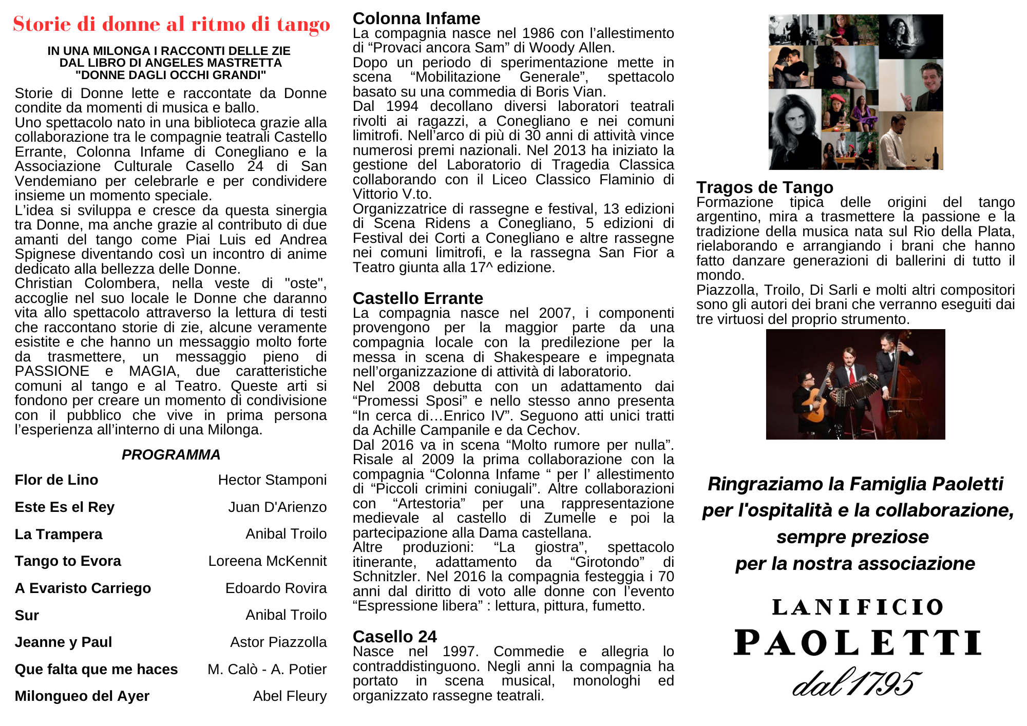 Uno spettacolo nato in una biblioteca grazie alla collaborazione tra le compagnie teatrali Castello Errante, Colonna Infame di Conegliano e la Associazione Culturale Casello 24 di San Vendemiano per celebrarle e per condividere insieme un momento speciale.