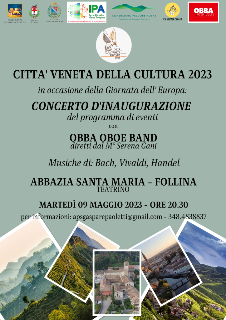 E’ quindi per noi un piacere presentarvi, il “Concerto d’ Inaugurazione” che avrà luogo martedì 09 maggio 2023, in occasione della Giornata dell’Europa, presso il Teatrino dell’Abbazia Santa Maria di Follina alle ore 20.30 e vedrà coinvolta l’OBBA Oboe Band, ensemble musicale di ance doppie, diretta dal Maestro Serena Gani.
