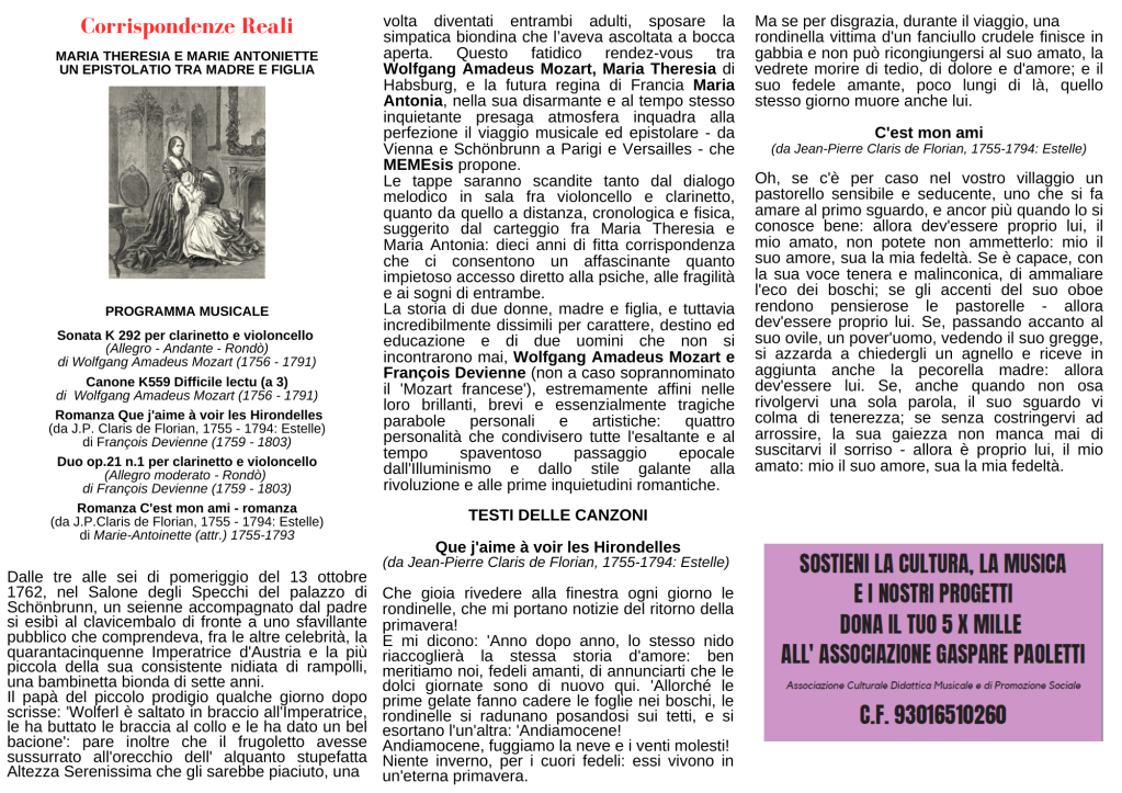Le tappe saranno scandite tanto dal dialogo melodico in sala fra violoncello e clarinetto, quanto da quello a distanza, cronologica e fisica, suggerito dal carteggio fra Maria Theresia e Maria Antonia: dieci anni di fitta corrispondenza che ci consentono un affascinante quanto impietoso accesso diretto alla psiche, alle fragilità e ai sogni di entrambe.