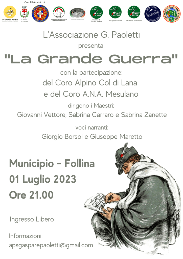 Con questo evento l’Associazione Paoletti ha voluto raccogliere attorno a se alcune tra le associazioni locali che maggiormente possono rappresentare quello che è stato il conflitto bellico della Prima Guerra Mondiale nella nostra terra: “La Grande Guerra” è infatti patrocinato oltre che dal Comune di Follina, che da sempre sostiene le attività di questa associazione, anche dall’Associazione Nazionale Cavalieri all’Ordine di Vittorio Veneto; dall’Associazione Italiana Ciechi di Guerra Consiglio Interregionale Nord – Italia, che da qualche mese ha sede proprio a Follina; dal Comitato per il Sacrario Austroungarico di Follina; dalla Sezione A.N.A. di Vittorio Veneto e dai Gruppi A.N.A. di Follina e Valmareno. Ma l’evento “La Grande Guerra” è anche il frutto di una collaborazione ancor più ampia data dalla partecipazione del Coro Alpino Col di Lana e del Coro A.N.A. Mesulano.