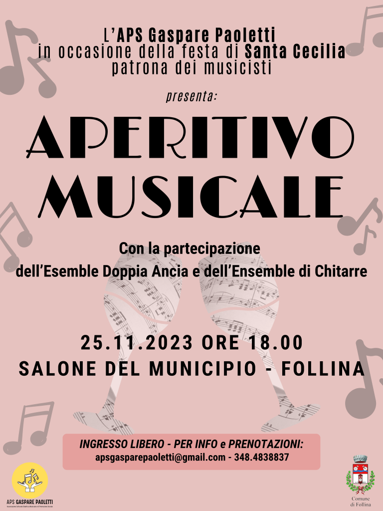Vi proponiamo il prossimo appuntamento dell’APS Gaspare Paoletti in occasione dei festeggiamenti di Santa Cecilia, patrona della musica, dei musicisti e dei cantanti: “Aperitivo Musicale” Sabato 25 novembre p.v. alle ore 18.00 presso il Salone del Municipio di Follina.