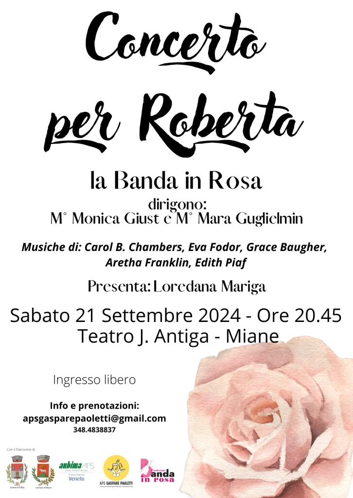 Per la seconda edizione del Concerto per Roberta, è stato scelto di omaggiare la Donna, la forza, il coraggio, la determinazione, ma anche la dolcezza che fanno di qualsiasi donna un’essere speciale; sarà una serata ricca di grandi emozioni, grazie all’esibizione sul palco de “La Banda in Rosa”, formazione bandistica interamente composta da musiciste donne, diretta da due direttrici: M° Monica Giust e dal M° Mara Guglielmin, anche il repertorio scelto sarà un omaggio alla figura femminile; a condurre la serata sarà Loredana Mariga.