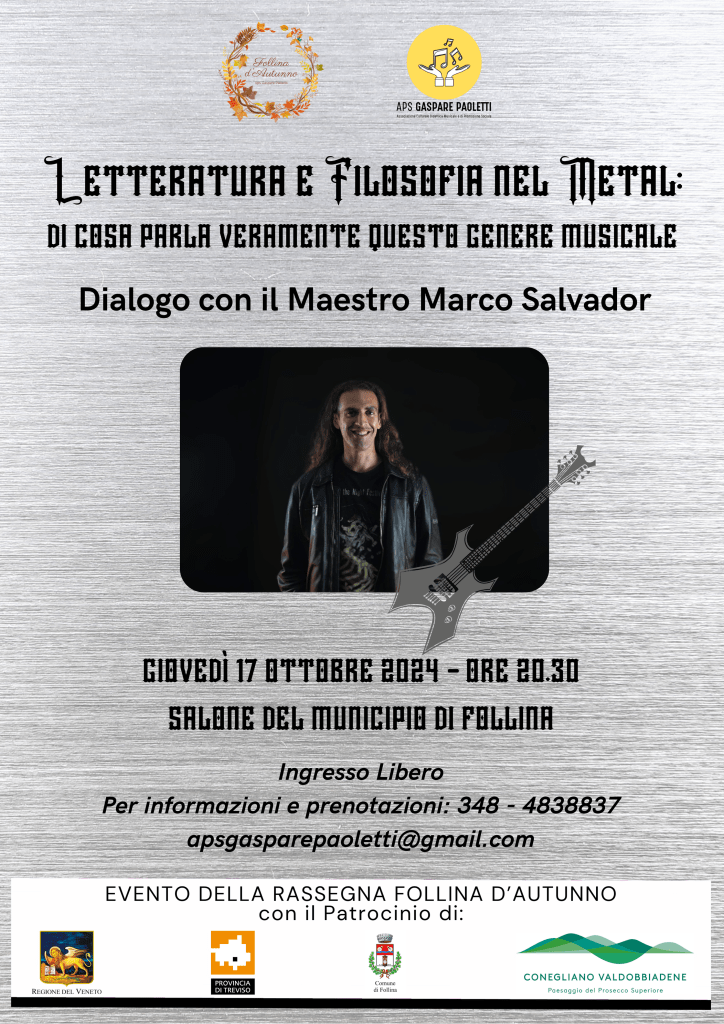 “Letteratura e filosofia nel metal: di cosa parla veramente questo genere musicale” – Giovedì 17 ottobre 2024 – ore 20.30 Salone del Municipio – Follina