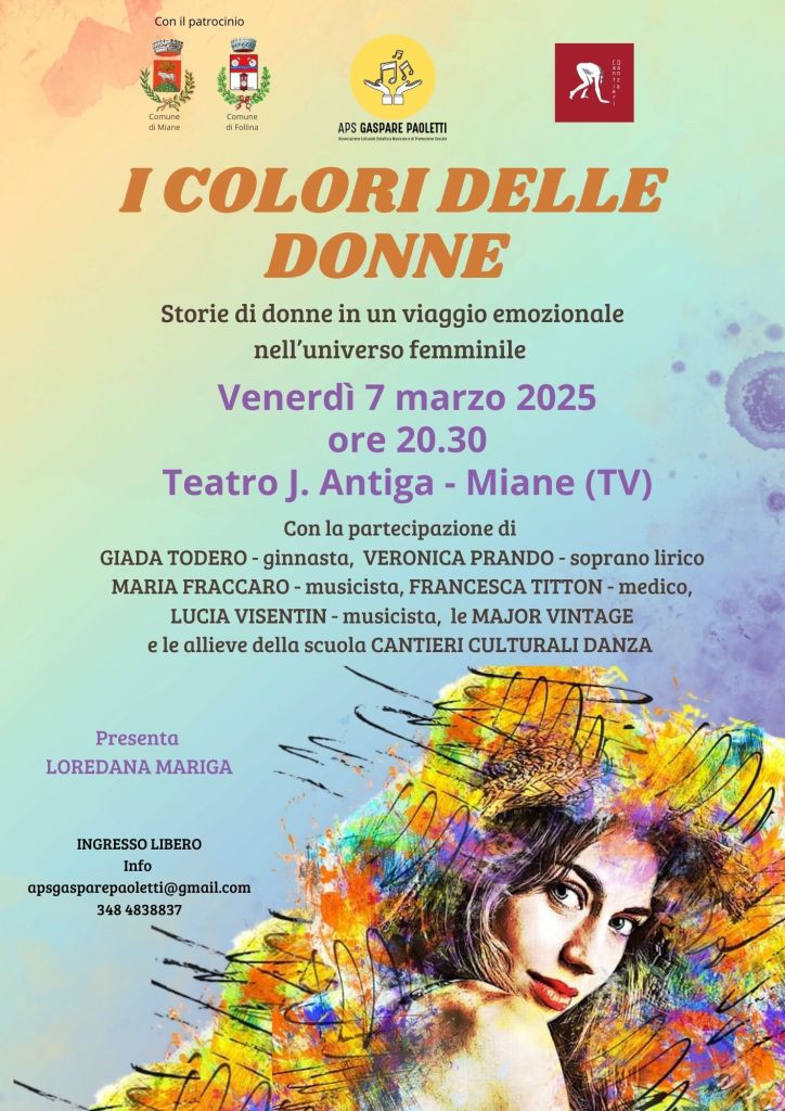 Venerdì 7 marzo dalle 20.30 il Teatro Antiga di Miane verrà invaso da “I colori delle donne”, evento voluto e promosso dall’ APS Gaspare Paoletti con il patrocinio del Comune di Miane e Follina, evento inedito e particolare in occasione della giornata internazionale della donna, che vuole andare controcorrente contrastando l’aspetto consumistico che ha preso piede negli ultimi anni in questa giornata, per dare invece il giusto valore alla figura femminile.