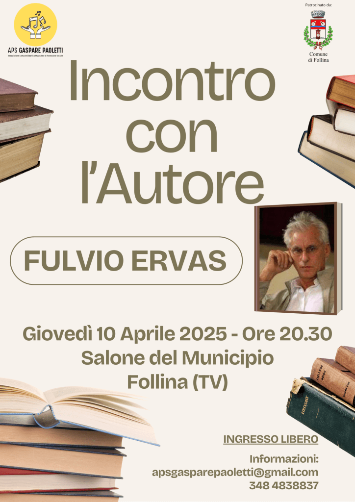 Per l’Associazione Gaspare Paoletti è un grande onore e piacere poter ospitare a Follina questa serata dedicata a Fulvio Ervas, uno dei più affermati scrittori del panorama locale. Sarà un’opportunità di dialogare direttamente con l’autore, scoprendo i suoi personaggi, come nascono, e come le storie li caratterizzano, o di scoprire la sua esperienza letteraria e creativa in un incontro che ha tutte le premesse per essere una serata coinvolgente