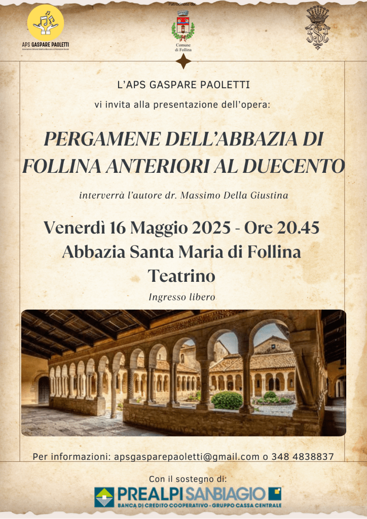 L’evento vedrà la partecipazione dell’autore dell’opera “Pergamene dell’Abbazia di Follina anteriori al Duecento”, il dr. Massimo Della Giustina, che illustrerà i contenuti e le scoperte di questa ricerca, offrendo al pubblico un’occasione unica di approfondimento e di scoperta delle pergamene più antiche dell’Abbazia di Follina.